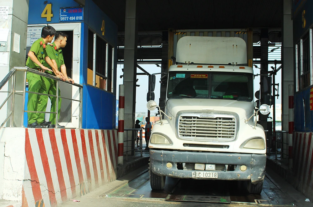 CS ma túy Công an quận 2 đứng ngay cabin để nhận diện tài xế nghi vấn. Ảnh: L. THOA