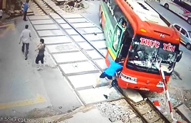 Xe khách bất ngờ đâm nát gác chắn tàu lửa, hành khách hoảng loạn hò hét thoát thân khi tàu đang đến gần.