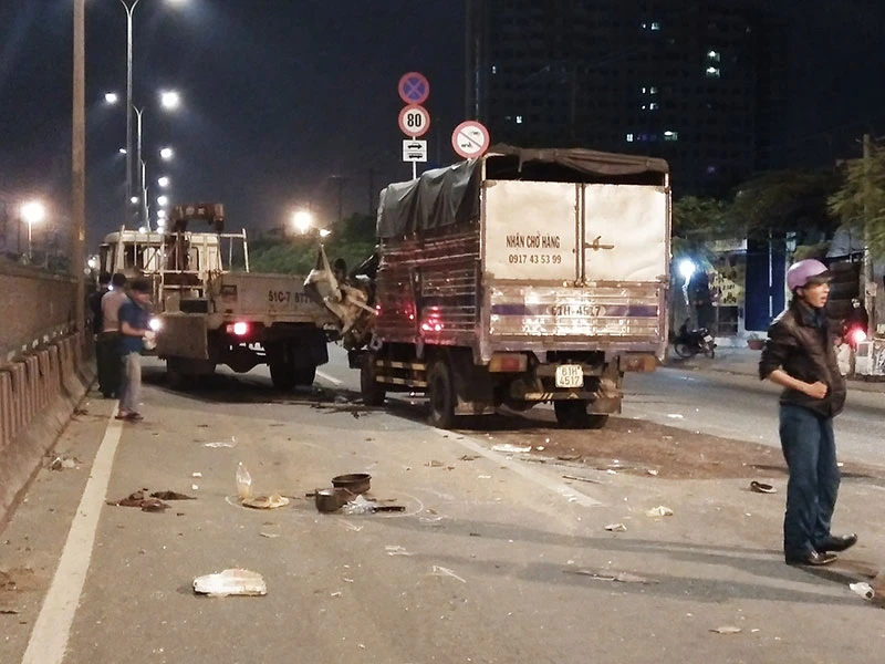 Cú tông trực diện với lực tác động mạnh tạo ra tiếng động rất lớn, xe tải cẩu bị đẩy tới trước, tài xế H. tử vong trong cabin, tài xế và phụ xe tải cẩu đang đứng sửa chữa sau xe tải cẩu bị thương nặng.