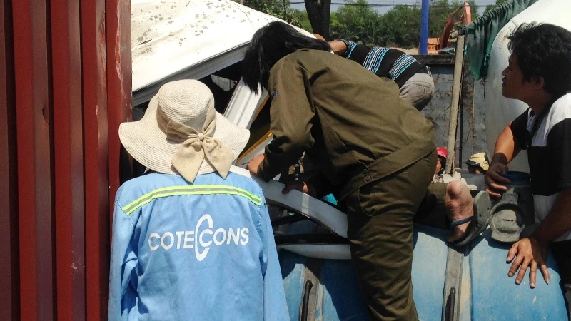 Tài xế và phụ xe mắc kẹt trong cabin móp méo sau cú tông, trong khi đó đầu xe bốc khói dữ dội do cháy; những người dân đã dùng bình cứu hỏa mini lao vào dập lửa trong khi đó phụ xe và tài xế mắc kẹt kêu cứu liên tục.