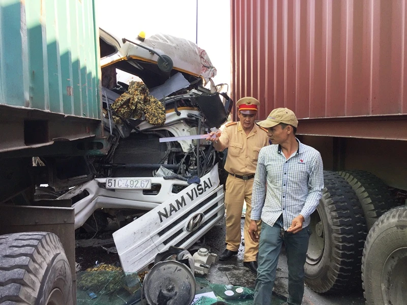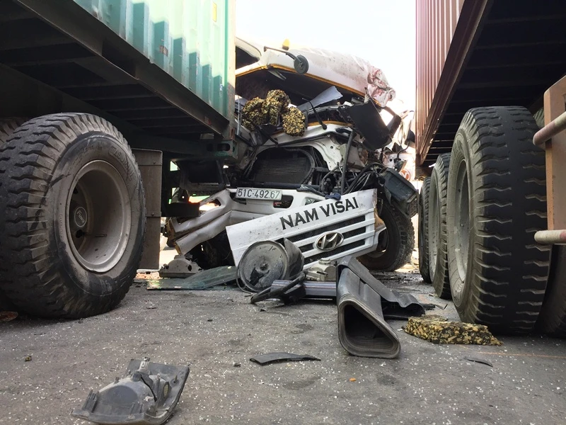 Tại hiện trường, đầu ô tô bị xé toạc, kính xe vỡ, nhiều bộ phận vỡ nát văng tung tóe khắp nơi, dầu nhớt lênh láng mặt đường; hai xe container cũng bị hư hỏng, móp méo sau cú tông. Các phương tiện nằm chắn hết hai làn đường ô tô khiến giao thông khu vực ùn ứ.
