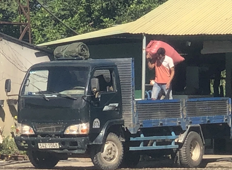 Chúng tôi ghi nhận vào thời điểm trên, xe tải 54Z-1048 lùi xe vào quán cơm ông Thoại. Lúc này, ông Thoại cùng tài xế vào kho cân cà phê trong khi phụ xe nhanh chóng vác những bao cà phê đó ra xếp đầy thùng xe.