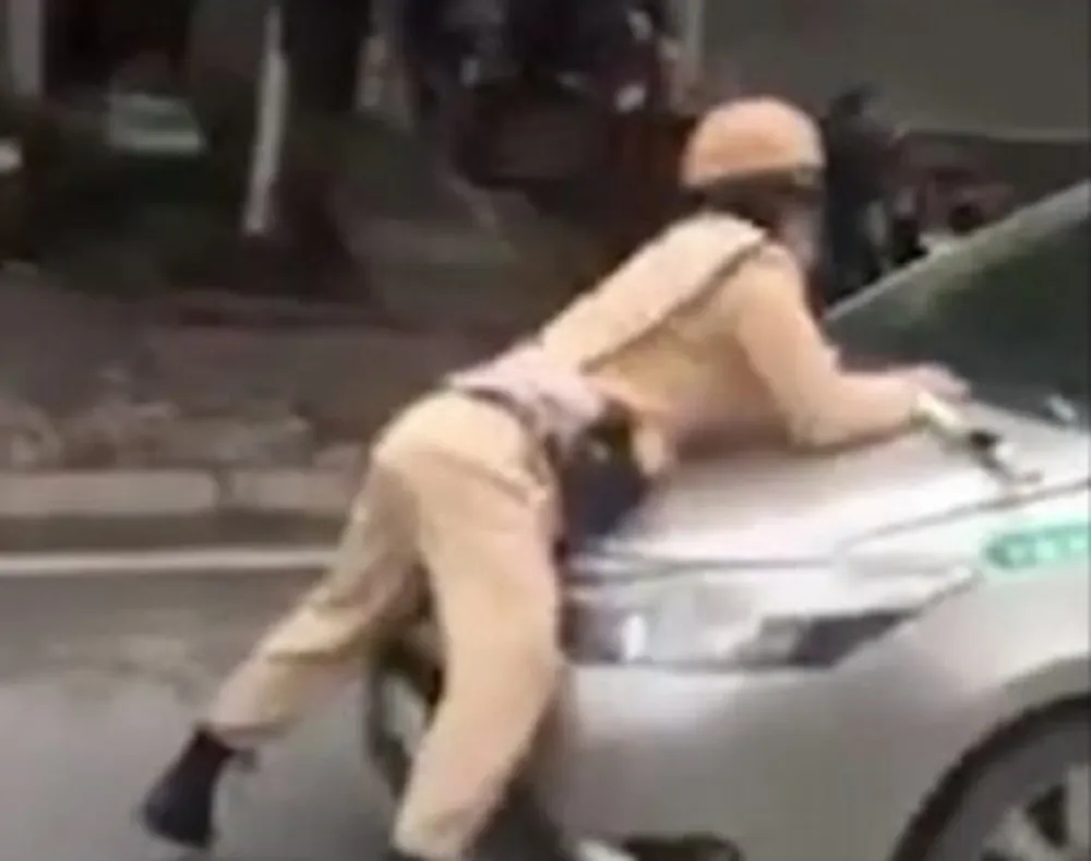 Vị trung úy CSGT bị tài xế taxi hất lên nắp capo. Ảnh: FB