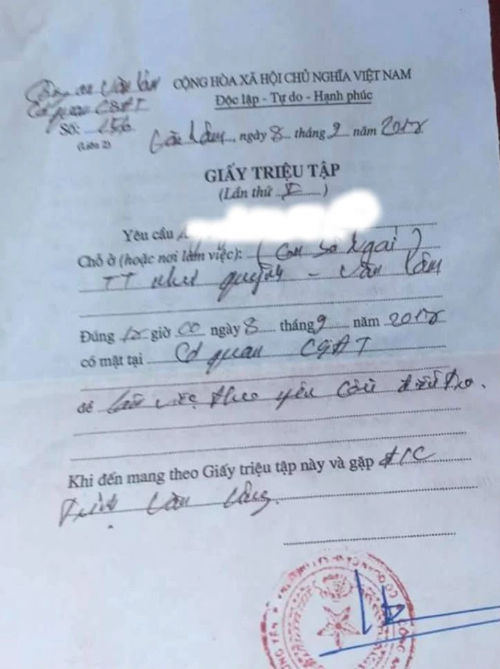 Giấy triệu tập tài xế lên làm việc. Ảnh: VIẾT LONG