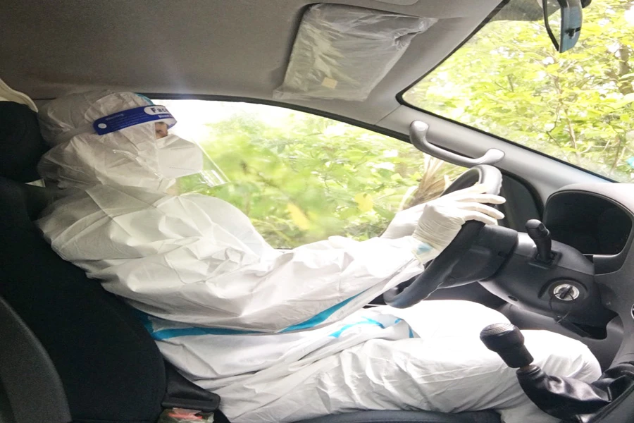 Anh Lê Thành Tâm trong bộ đồ bảo hộ lái xe cứu thương chở F0. Ảnh: ĐH