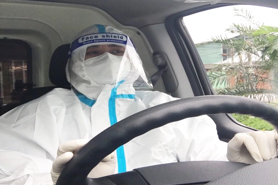 Tài xế Lê Thành Tâm tình nguyện lái xe cứu thương chở F0 tại Tiền Giang. Ảnh: ĐH