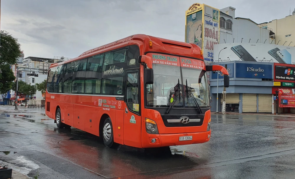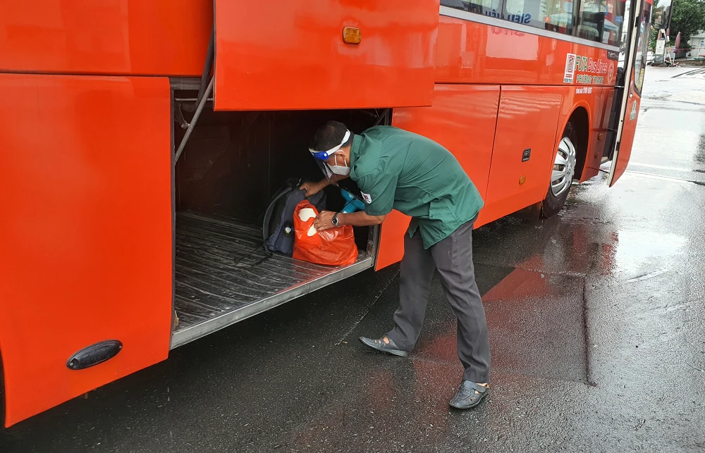 Mỗi ngày, từ 8 giờ 30 sáng, các xe khách giường nằm được dùng để đưa các bệnh nhân COVID-19 bắt đầu tập trung ở bệnh viện dã chiến. Các chuyến xe này sẽ đều đặn đón những bệnh nhân xuất viện về nhà miễn phí.