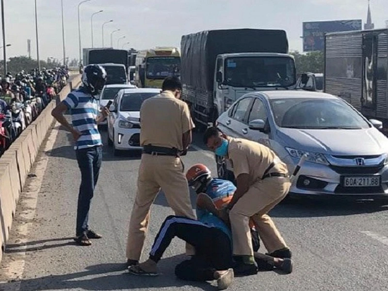 Khi chạy đến cuối cầu vượt Tân Vạn trên quốc lộ 1A (tỉnh Bình Dương), lực lượng chức năng mới chốt chặn bắt được tài xế và phụ xe đưa về xử lý.