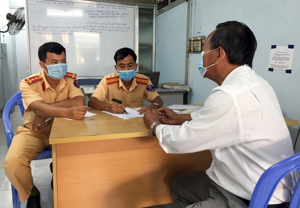 Ông TVM (áo trắng), tài xế điều khiển xe biển xanh chạy ngược chiều tại buổi làm việc với Công an. Ảnh: KM