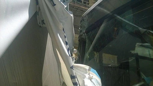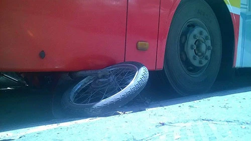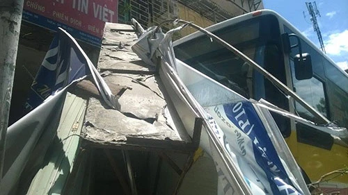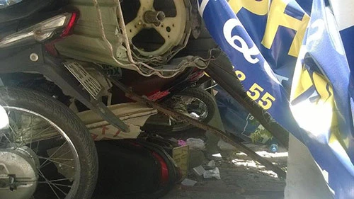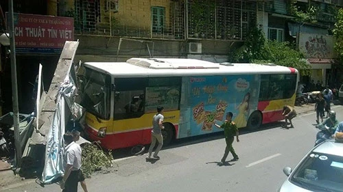 Chiếc xe tiếp tục đâm nhiều xe máy đang dựng ở trước nhà số 202 ngã la liệt, trong đó có một chiếc xe máy bị cuốn vào gầm xe buýt, chiếc cửa cuốn và biển quảng cáo cũng bị sập sau cú đâm.