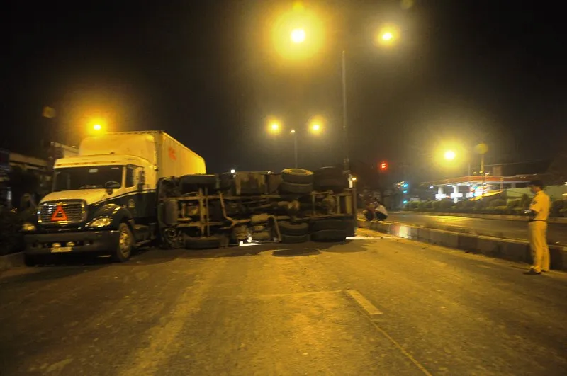 Cú tông mạnh tạo ra một tiếng động lớn, chiếc xe ben lật nghiêng xoay 90 độ; trượt dài sang trái khoảng 20 m mới dừng lại, đất cát trên xe đổ tràn ra đường chắn hết làn đường ô tô. Tài xế mắc kẹt trong cabin bị thương nhẹ, sau đó tìm cách bò ra đường.