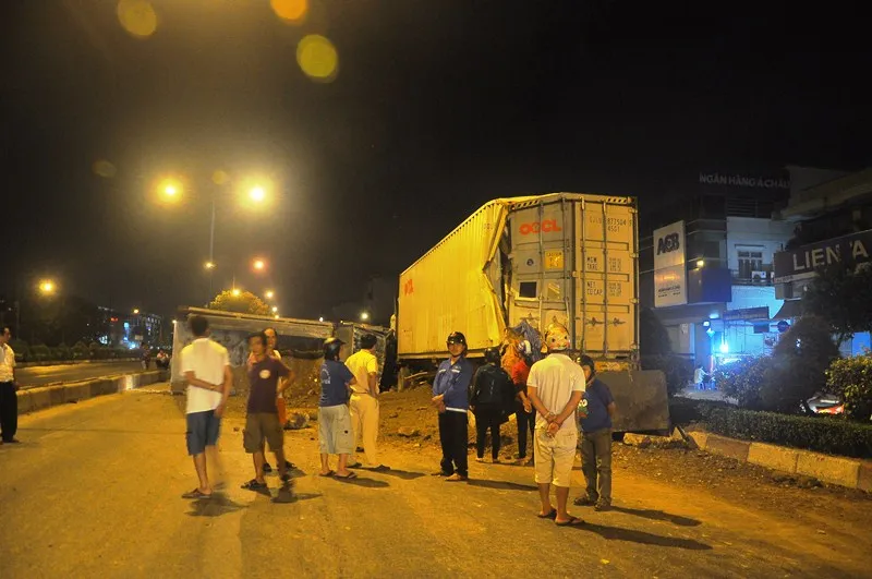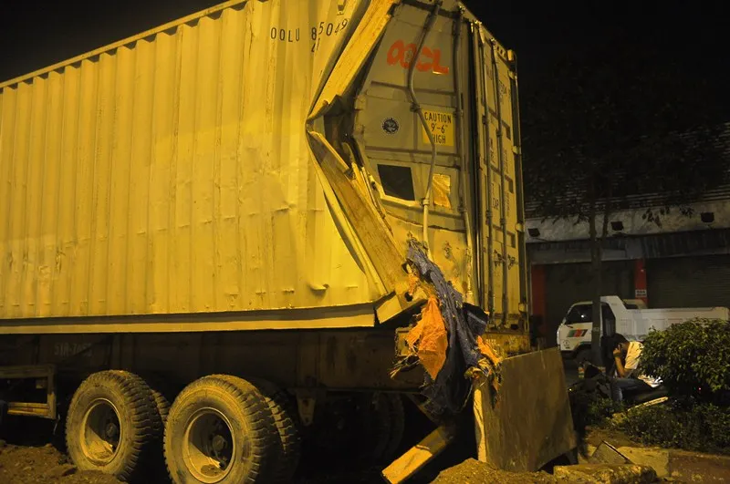 Tại hiện trường, chiếc xe ben bị móp nặng phần đầu, kính xe bị xé toạc; đuôi container móp sâu vào trong.