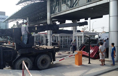 Lúc đến gần làn xe thu phí tự động OBU (quận 2, TP.HCM), anh Thành nhìn thấy thanh chắn phía trước chưa kéo lên, buộc phải thắng gấp. Lúc này hàng chục tấn thép lá từ thùng container dồn tới lao về trước đè lên gây bẹp dúm cabin. Tài xế Thành bị thương kẹt trong cabin được nhân viên trạm thu phí đập cửa đưa ra ngoài.