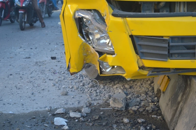 Phần đầu xe bị hỏng, nhiều phiến bê tông bị xô đẩy, nát vụn (ảnh A.S)