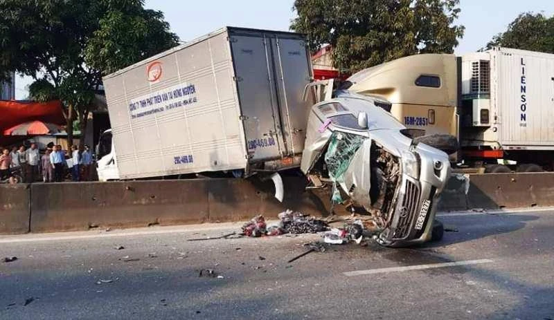 Vào thời điểm đó, xe tải mang BKS đăng ký ở Hà Nội 29C- 469.08 và xe ô tô bán tải đăng ký ở Nghệ An 37A-238.81 đang dừng đèn đỏ thì bị xe container đầu kéo mang BKS 16M-2851 kéo rơ moóc BKS 15R- 105.04 đâm vào đuôi xe xe bán tải. Cú đâm mạnh khiến xe container đẩy xe bán tải lao lên đâm vào đuôi xe tải rồi “ép” xe bán tải lao lên lật nghiêng trên dải phân cách cứng giữa quốc lộ. Vụ tai nạn làm xe bán tải dẹp dúm, tài xế xe bán tải và một người khác ngồi trên xe cùng bị thương. Cả hai người bị thương được đưa đi cấp cứu.