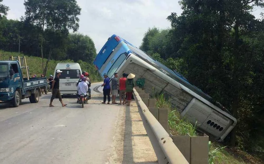Vào thời điểm nêu trên, xe khách mang BKS 37B-020.40 chạy hướng TP Hồ Chí Minh- Hà Nội, bất ngờ gặp hai học sinh trên nhau, ngã xuống mặt đường. Lúc này, tài xế xe khách phải phanh gấp và bẻ lái để tránh hai học sinh. Do phanh và bẻ lái đột ngột, xe bị lao gãy lan can rồi lật nghiêng bên vệ đường.
