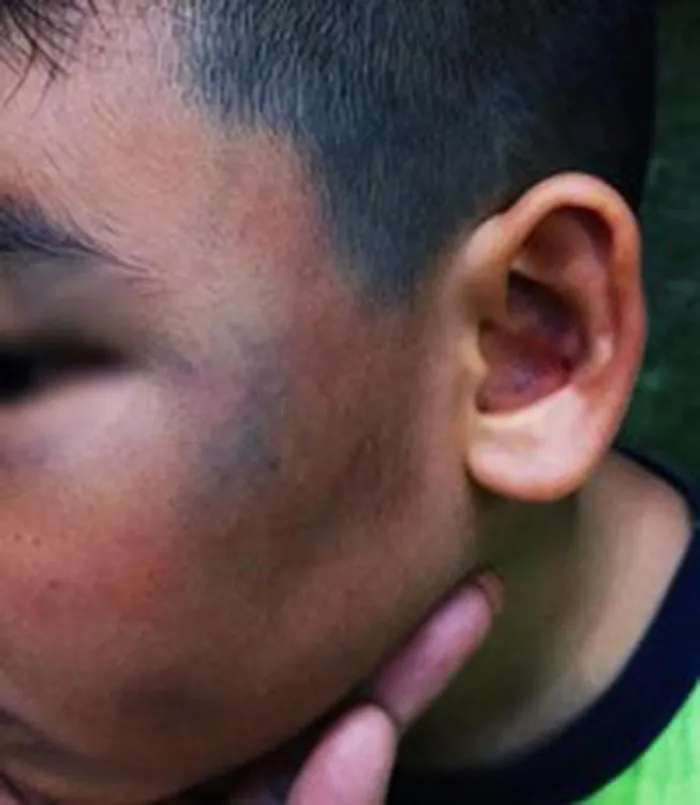 Tưởng các bé trộm gà, Tuấn nắm cổ áo cả hai anh em rồi đánh liên tiếp vào mặt bé C. khiến bé bị bầm tím hai bên má, tai.