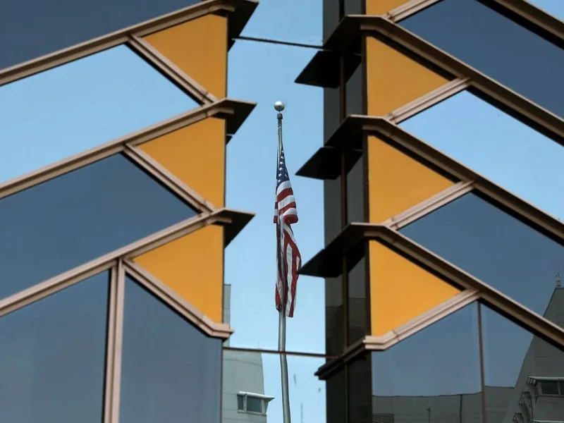 Cột cờ treo quốc kỳ Mỹ phản chiếu qua kính ở mặt tiền Đại sứ quán Mỹ tại Kabul (Afghanistan). Ảnh: REUTERS