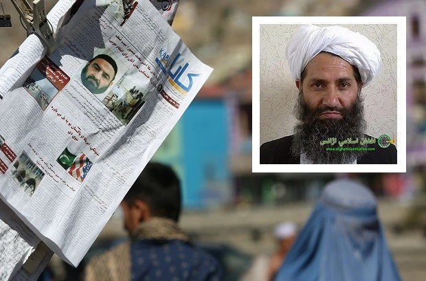 Báo Afghanistan ngày 25-5 đưa tin về việc Haibatullah Akhundzada (trong ảnh nhỏ) lên làm thủ lĩnh mới của Taliban. Ảnh: AP