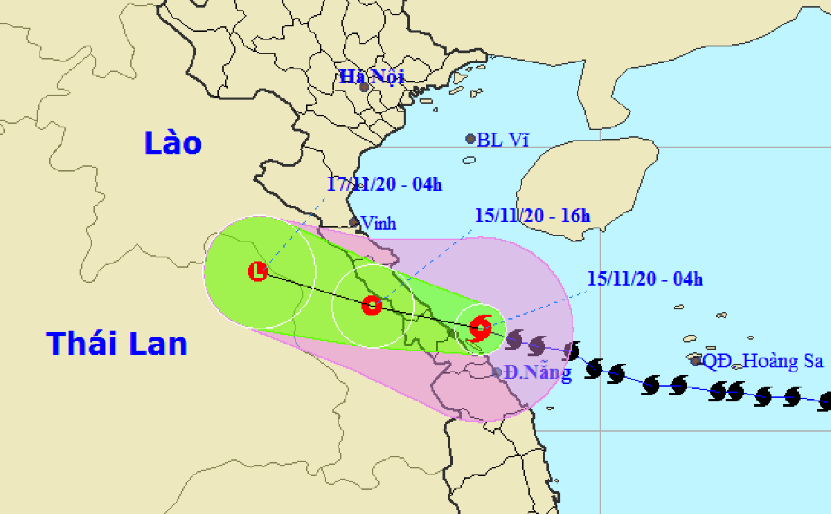 Đến 16 giờ ngày 15-11, vị trí tâm áp thấp nhiệt đới ở khoảng 17,2 độ Vĩ Bắc; 106,0 độ Kinh Đông, trên khu vực Thượng Lào. Sức gió mạnh nhất vùng gần tâm áp thấp nhiệt đới mạnh cấp 6 (40-50km/giờ), giật cấp 8.