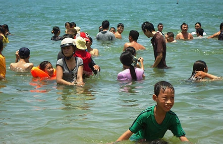 Từ già cho đến trẻ, ai cũng hồ hởi vùng vẫy trong nước biển tạo bầu không khí náo nhiệt giữa cái nắng chói chang của mùa hè.