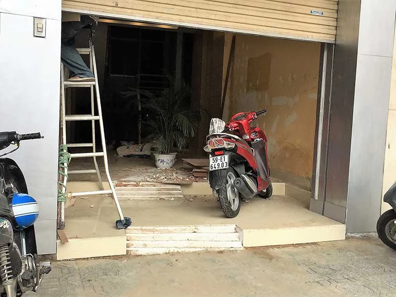 Nhà 130 Trần Quang Khải đã xây thềm dốc nghiêng nằm bên trong nhà cho xe ra vào nhà, không lấn vỉa hè như trước. Ảnh: MP