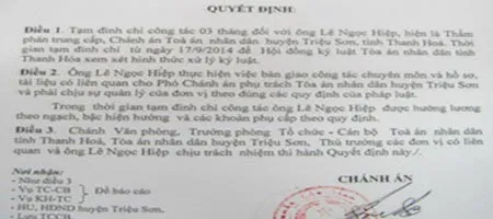 Quyết định đình chỉ công tác chánh án TAND huyện Triệu Sơn. Ảnh: ĐẶNG TRUNG