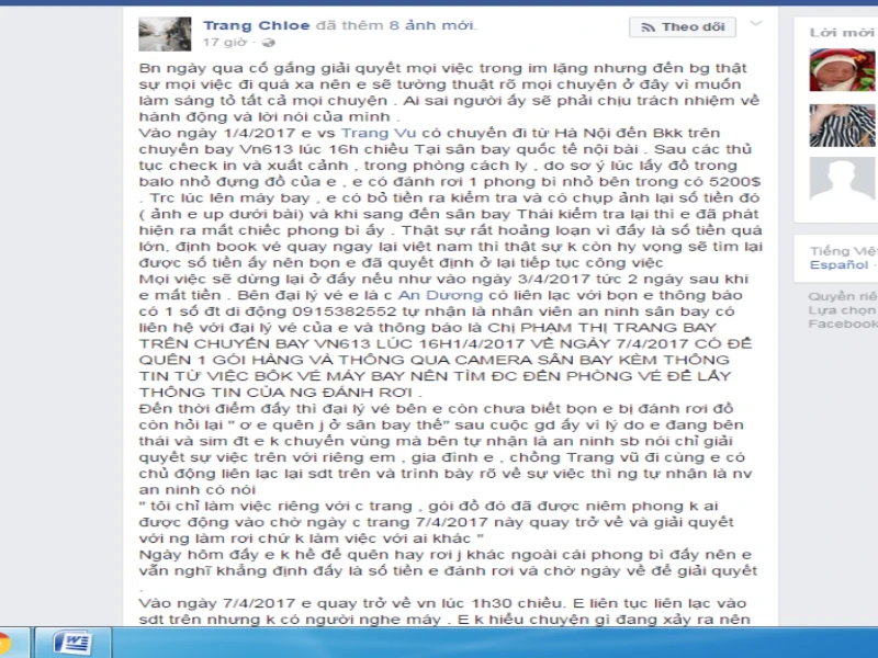 Trước đó, Pháp Luật TP.HCM đã thông tin phản ánh chủ nhân Facebook "Trang Chloe" đăng thông tin vào lúc 16 giờ ngày 1-4, chị Phạm Thị Trang có hành trình từ Nội Bài (Hà Nội) - Bangkok (Thái Lan) trên chuyến bay VN613. Theo đó, chị Trang đã đánh rơi 5.200 USD tại phòng cách ly sân bay Nội Bài.