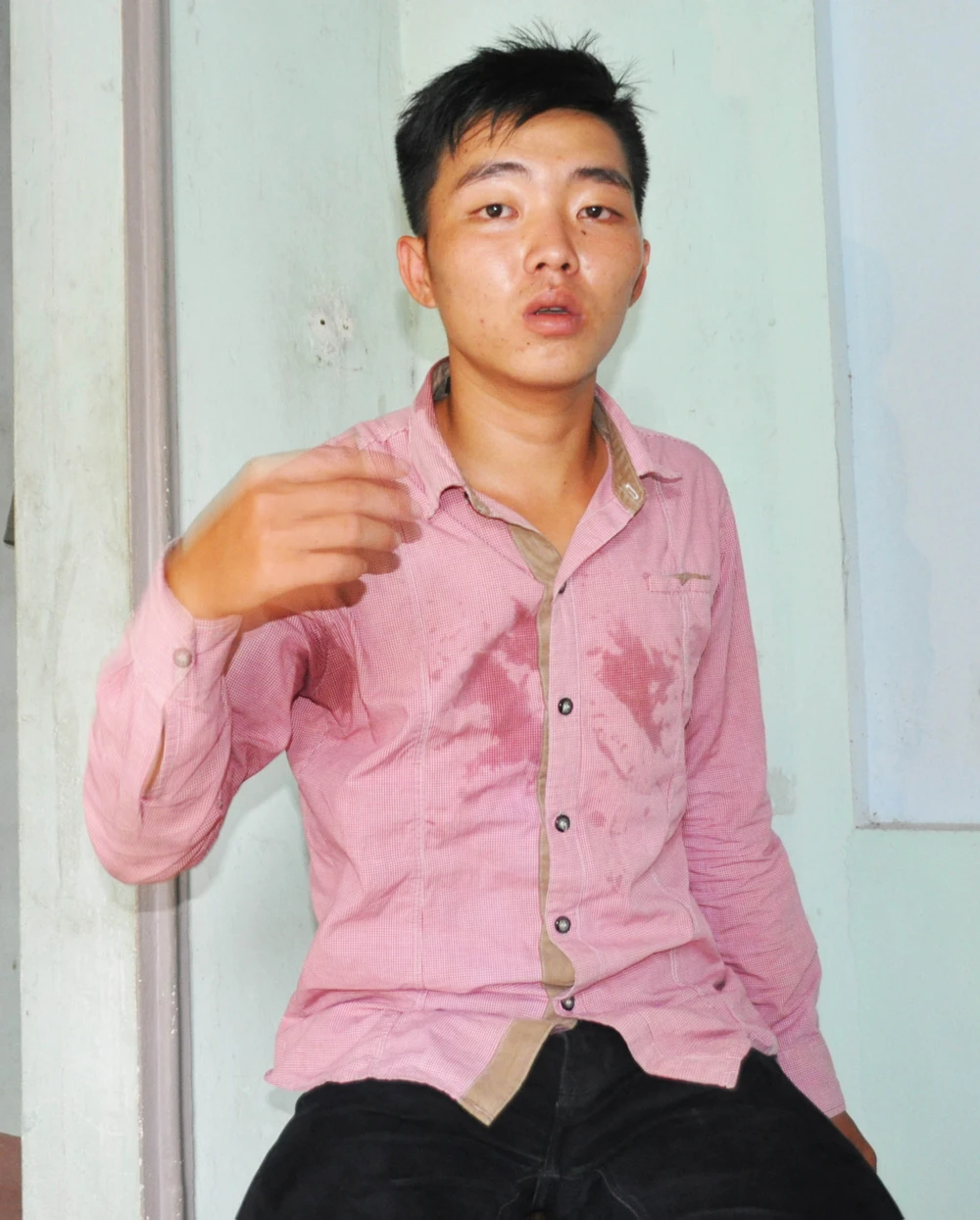 Anh Nguyễn Kim Thành thuật lại việc bị trưởng công an xã đánh đập, tra khảo. Ảnh: TẤN LỘC
