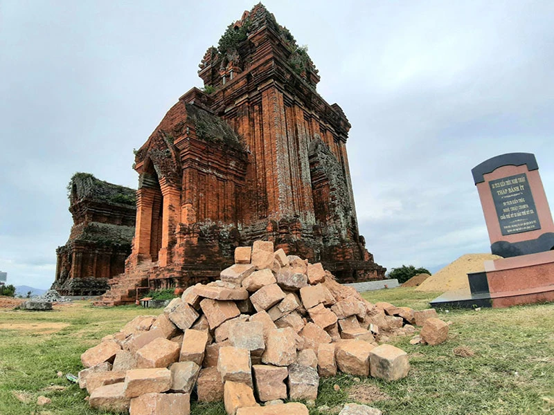 Nhiều khu vực di tích tháp Bánh Ít bị biến dạng do thi công. Ảnh: NO