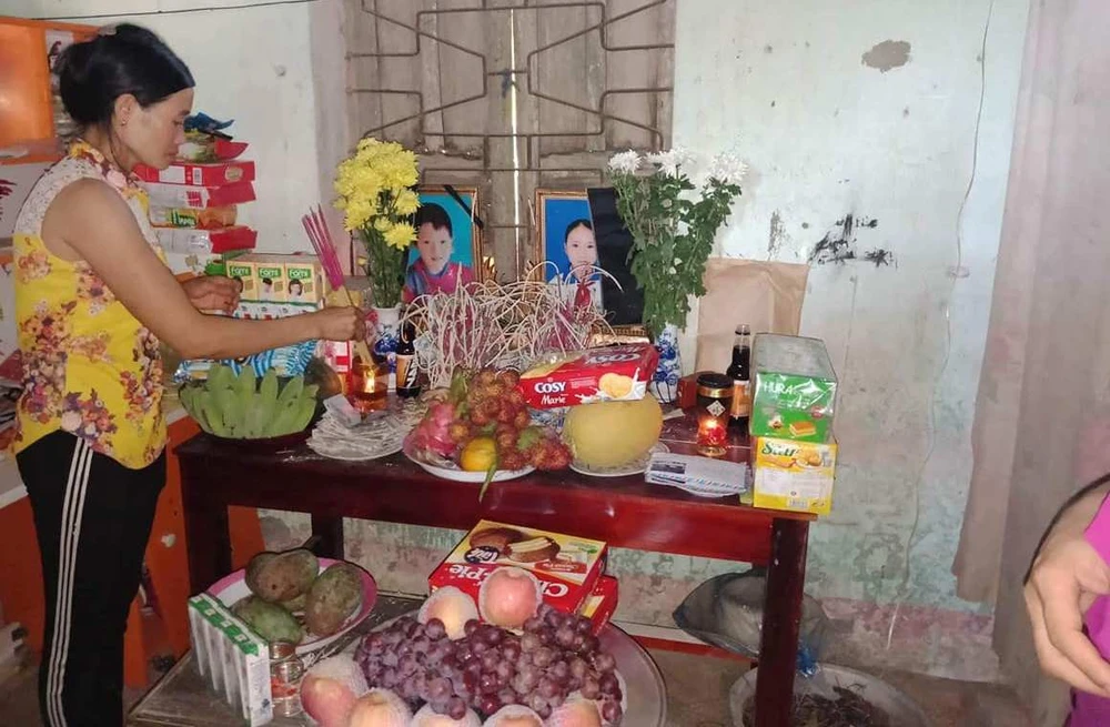 Bàn thờ di ảnh hai chị em nạn nhân Ngô Thị Thu (12 tuổi), Ngô Thành Đạt (năm tuổi).