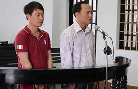 Bị cáo Lê Mạnh Nam (phải), nguyên phó trưởng Công an thị xã Gia Nghĩa và Trần Đăng Tùng (nguyên đội trưởng Đội Cảnh sát điều tra Công an thị xã Gia Nghĩa) tại phiên tòa xử tội giữ người trái pháp luật tại TAND tỉnh Đắk Nông ngày 9-4-2015. Ảnh: ĐẠI DŨNG