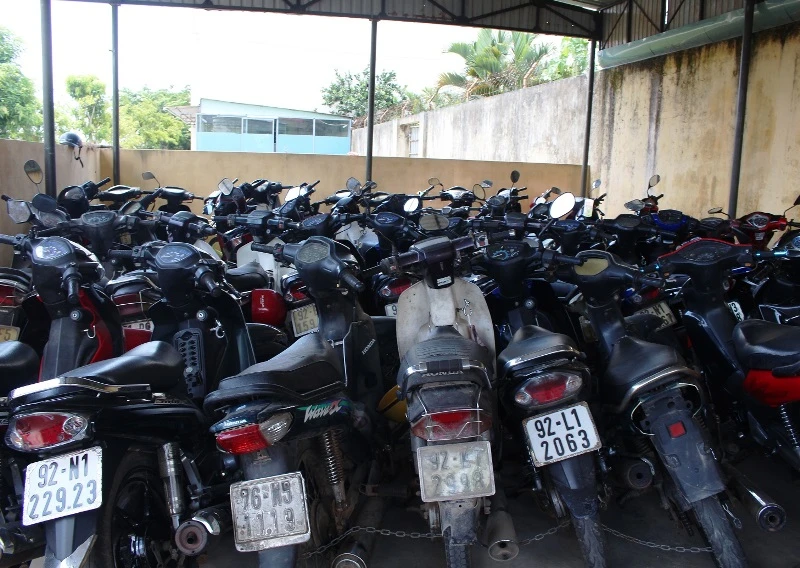 52 mô tô bị tạm giữ tại cơ quan điều tra. Ảnh CQĐT