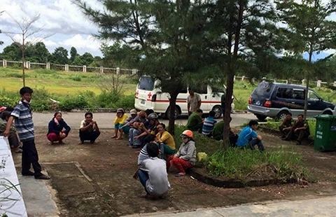 Người nhà tập trung trước BV Hàm Tân để làm thủ tục nhận thi thể Bùi Châu Giang về lo hậu sự. Ảnh: PN