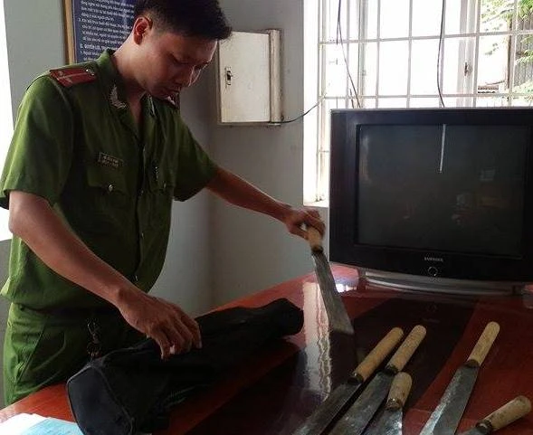 Qua kiểm tra, công an đã phát hiện có khoảng 10 hung khí gồm dao và mã tấu tự chế được đựng trong một túi đen.