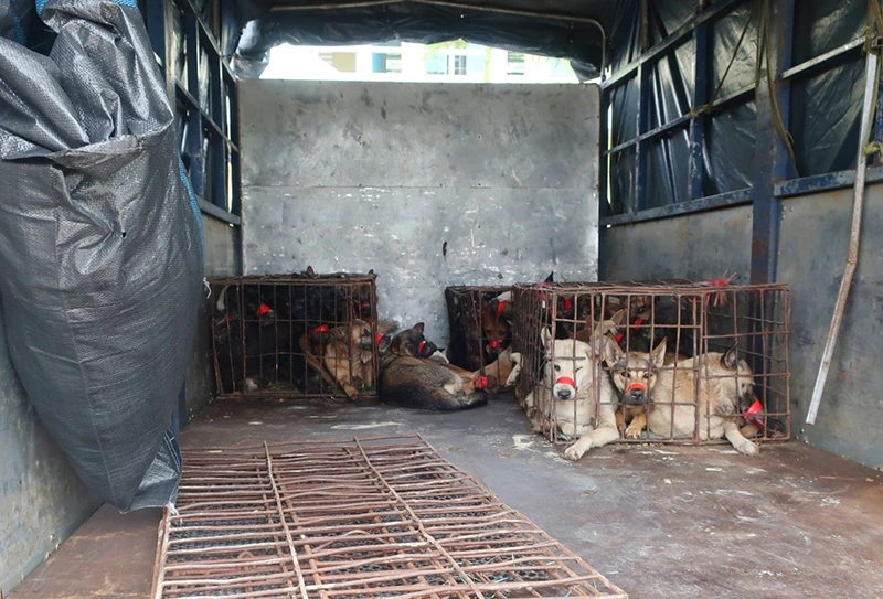 Lực lượng chức năng phát hiện trong xe tải có 27 con chó bị bịt miệng, một số con đã chết.