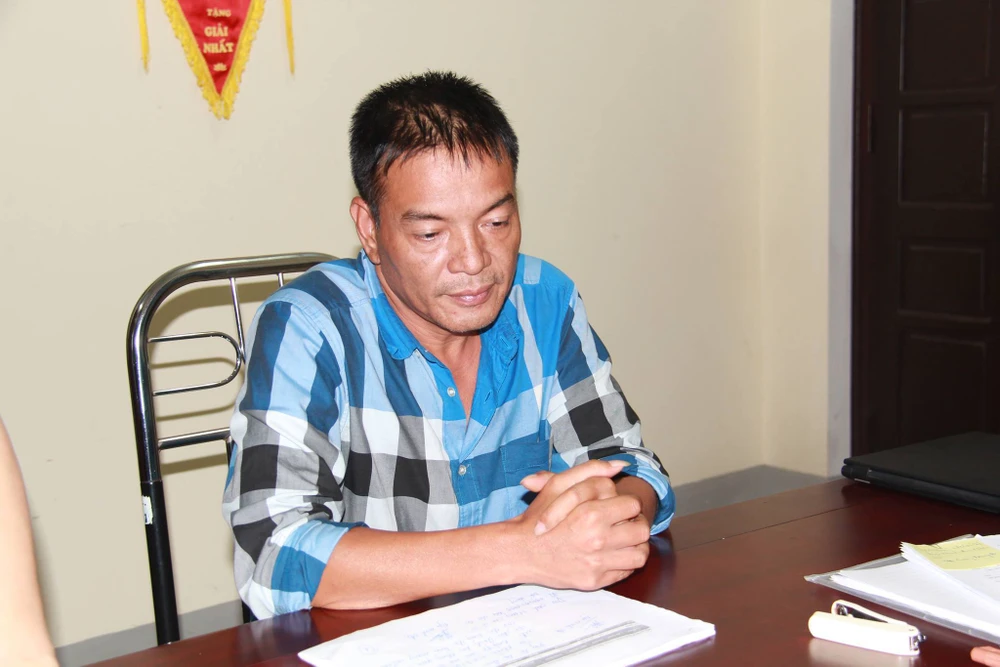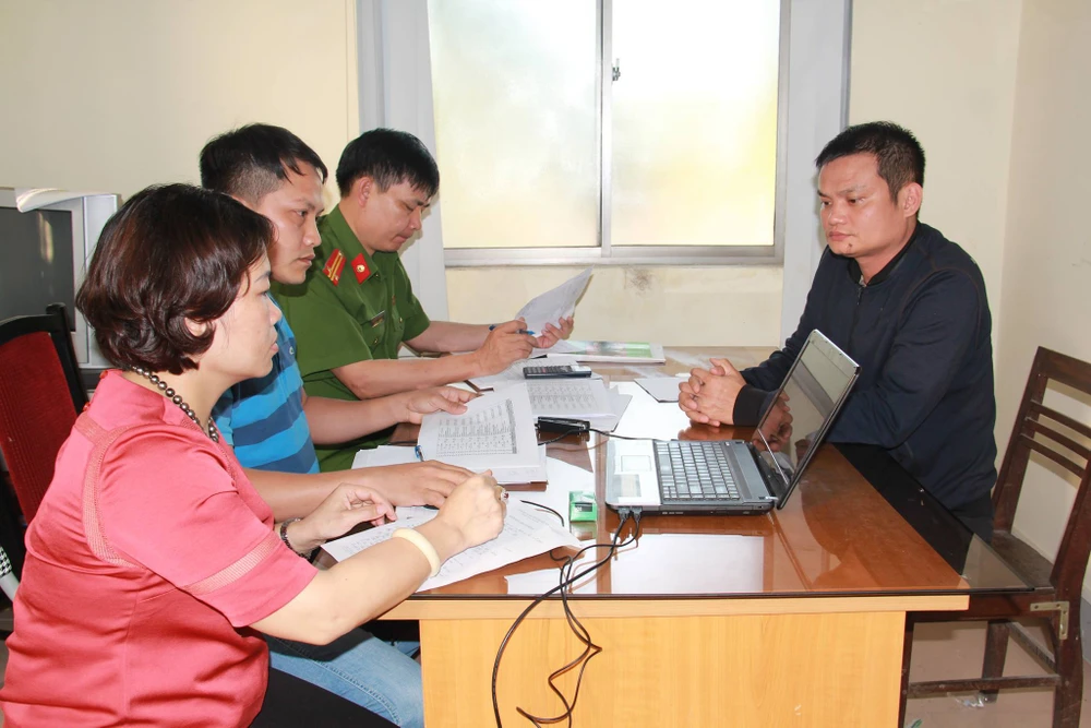 Công an đang lấy lời khai của Trần Thế Hùng (phải).