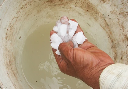 Người dân huyện Đồng Xuân (Phú Yên) đem phân Kali Nitratte nghi làm giả hòa vào trong nước thì đóng thành cục. Ảnh: TẤN LỘC