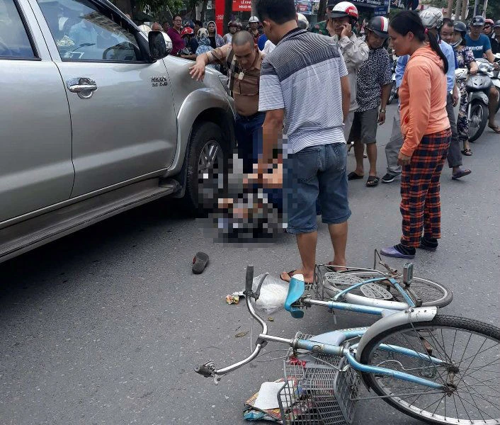 Tài xế xe bán tải dừng xe rồi xuống “hùng hổ” mở cửa trước của xe Kia Morning màu đỏ rồi quát lớn rồi lên xe lùi nhanh qua ngã tư, cán vào một phụ nữ đang đi xe đạp.