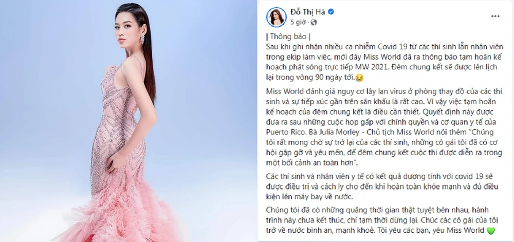Giữa đêm 16-12 (giờ Việt Nam) fanpage Miss World bất ngờ đăng tải thông cáo báo chí về việc tạm thời hoãn đêm Chung kết của Miss World 2021 như dự kiến đã đưa ra trước đó (6h sáng nay, 17-12 - giờ Việt Nam).