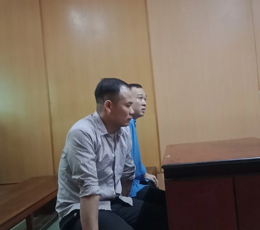 Bị cáo Vinh (áo xanh) và Tuấn tại tòa. Ảnh: CÙ HIỀN.