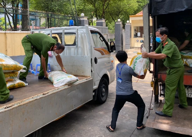 Công an phường Hiệp Phú chuẩn bị đưa lương thực đến hỗ trợ bà con khu phong tỏa. Ảnh: TRẦN NGỌC