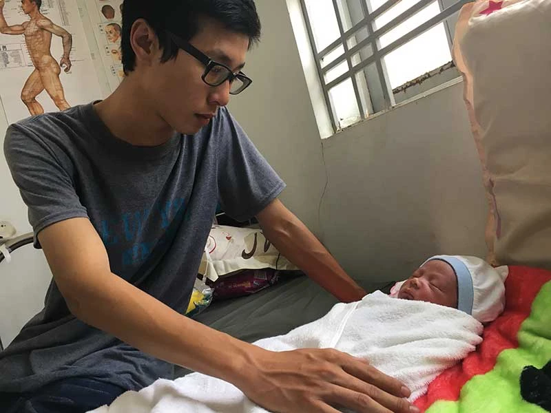 Chàng trai Phan Nguyễn Trí Dũng cùng bé trai bị bỏ rơi mà anh nhặt được. Ảnh: HOÀNG LAN