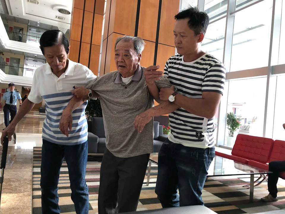 Phó Chủ tịch Liên chi hội Cựu cầu thủ TP.HCM - Hồ Thanh Cang (trái) dìu đàn anh Trần Văn Nhung đi lại khó khăn do bệnh tật.