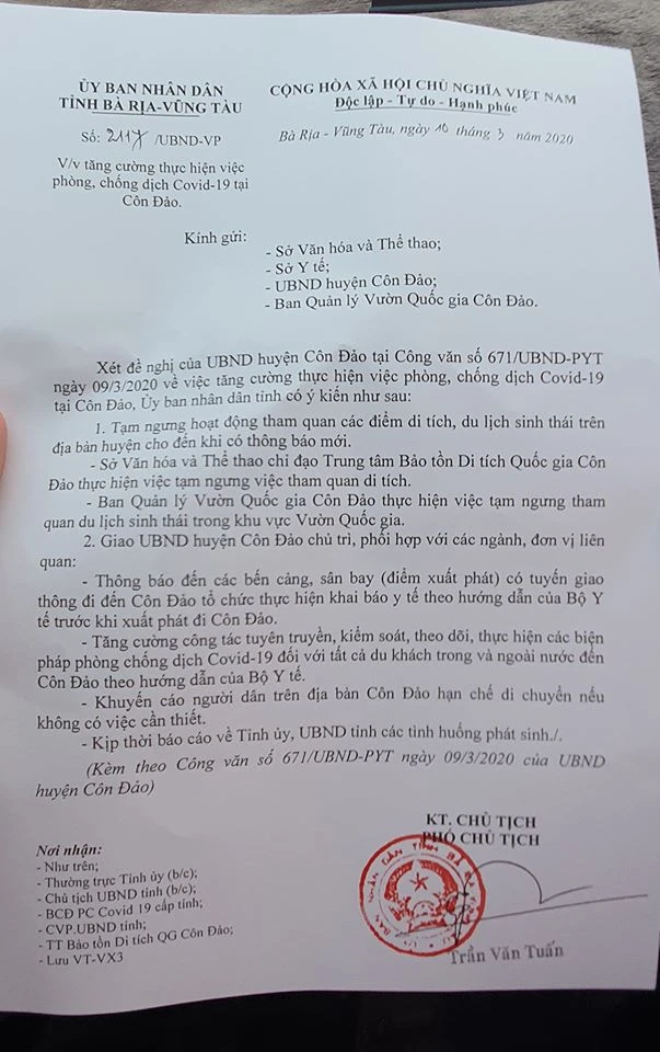 Trước đó, ngày 9-3, UBND huyện Côn Đảo căn cứ tình hình thực tế địa phương có văn bản xin ý kiến tỉnh về việc tạm dừng tiếp đón du khách trong và ngoài nước đến địa phương này.