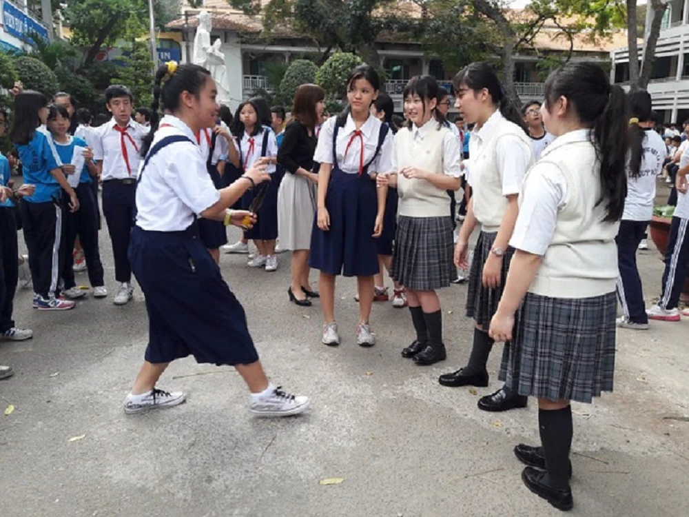 Học sinh từ Trường BuNan Nhật Bản được các thầy, cô giáo đưa đến Trường THCS Lê Quý Đôn (quận 3, TP.HCM). Ảnh: HÀ PHƯỢNG