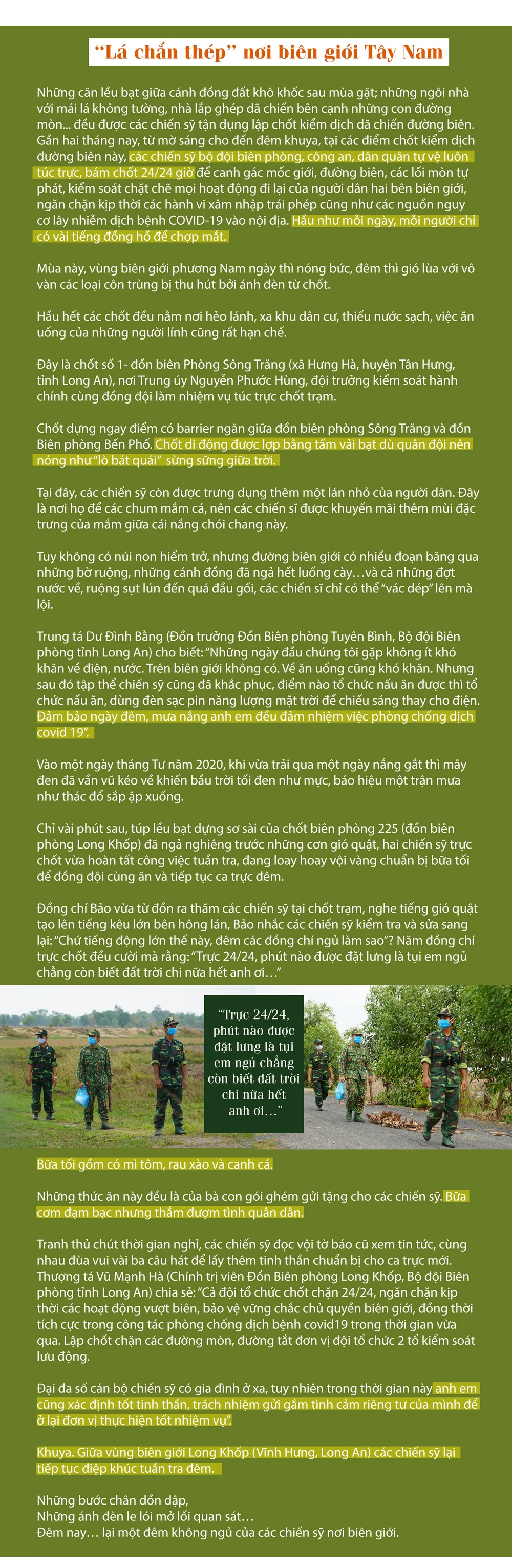 Cất điện thoại vào túi, Việt quay sang tiếp chuyện với chúng tôi: “Khi nhận điện công tác mình có chút bất ngờ vì đang trong kỳ nghỉ phép 20 ngày, mình mới nghỉ được một nửa. Lúc ấy mình đang tổ chức sinh nhật cho người yêu thì nhận được điện từ đồn trưởng. Bạn gái nghe xong buồn lắm nhưng yêu lính là xác định hy sinh và cảm thông thôi. Ngay trong đêm mình gói ghém tư trang, rời nhà lên đơn vị nhận quyết định đi tăng cường chống dịch”.