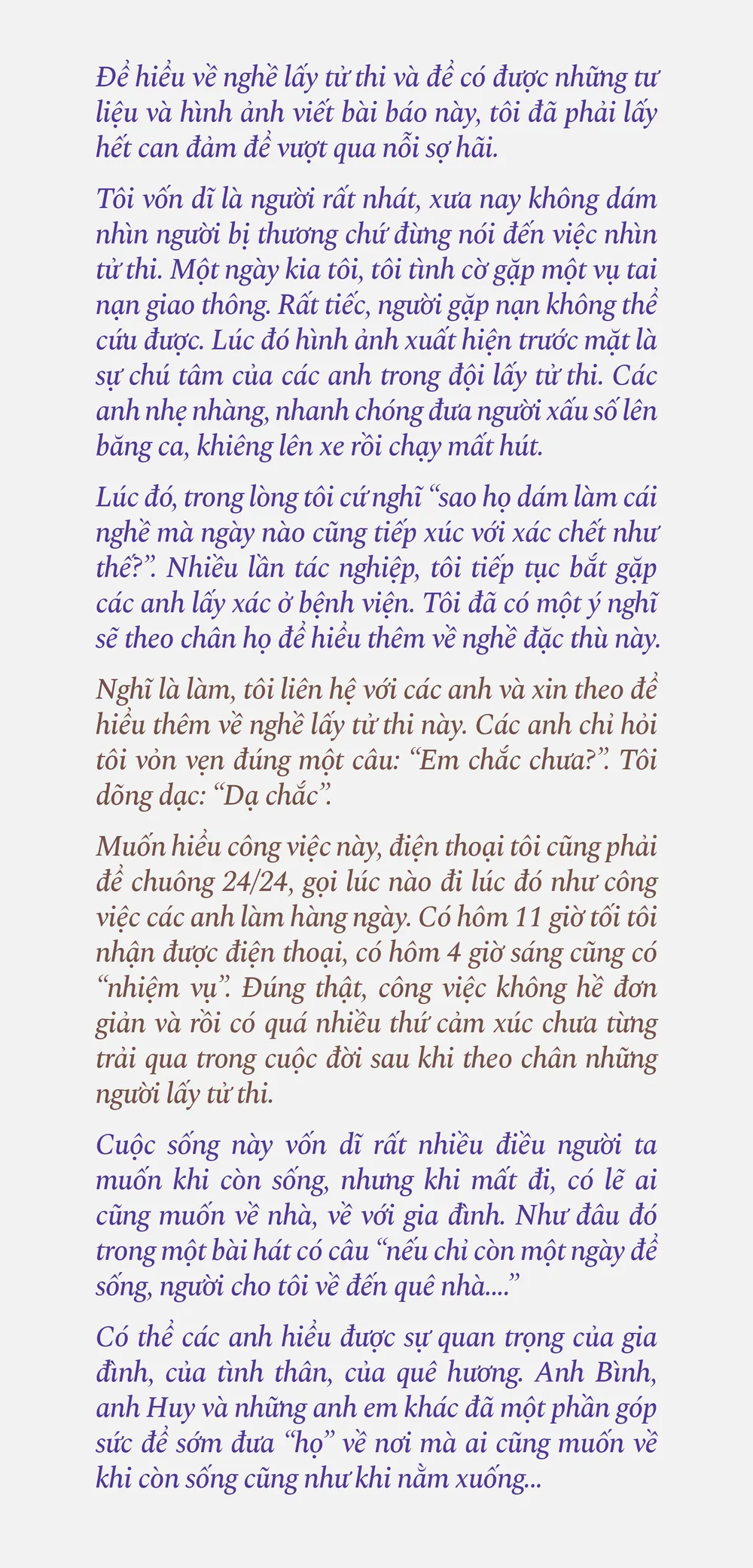 Đôi mắt ngấn lệ nhìn xa xăm, anh Huy kể: “Nhiều trường hợp người mất rất bi thương. Tôi nhớ nhất chắc là câu chuyện cách đây vài năm ở một cánh đồng đầy cỏ, có ba người tự tử. Trời hôm đó trời tối lắm, tụi tôi cùng với công an phải vạt cỏ năng để lấy tử thi của ba người. Khi thấy họ, tim tôi như thắt lại! Rất thương!. Trong công việc, tôi chứng kiến nhiều chuyện bi thương lắm cô ơi!”
