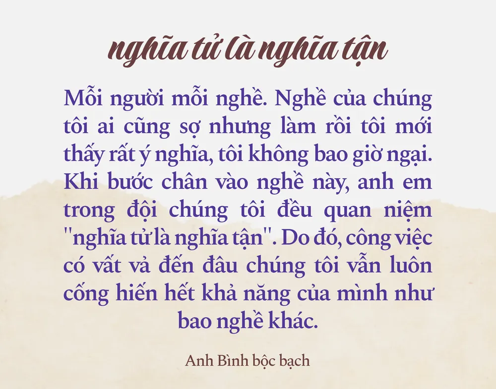 “Mỗi người mỗi nghề. Nghề của chúng tôi ai cũng sợ nhưng làm rồi tôi mới thấy rất ý nghĩa, tôi không bao giờ ngại. Khi bước chân vào nghề này, anh em trong đội chúng tôi đều quan niệm "nghĩa tử là nghĩa tận". Do đó, công việc có vất vả đến đâu chúng tôi vẫn luôn cống hiến hết khả năng của mình như bao nghề khác"- Anh Bình bộc bạch.