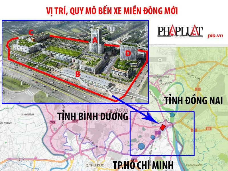 Theo Phó Chủ tịch UBND TP Lê Văn Khoa, Bến xe Miền Đông mới rộng 16 ha (nằm ở phường Long Bình, quận 9, TP.HCM và phường Bình Thắng, thị xã Dĩ An, Bình Dương), lớn gấp ba lần bến hiện hữu, được xây dựng nhằm đáp ứng nhu cầu phát triển của TP.